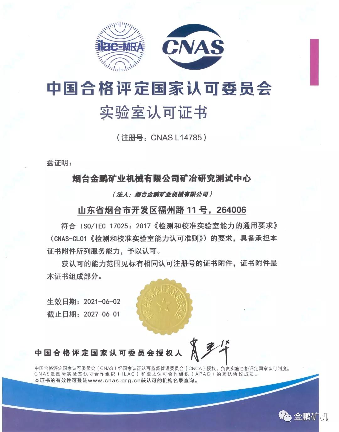 碩果源于奮斗 創新彰顯實力——熱烈祝賀金鵬礦機礦冶研究測試中心通過CNAS認證