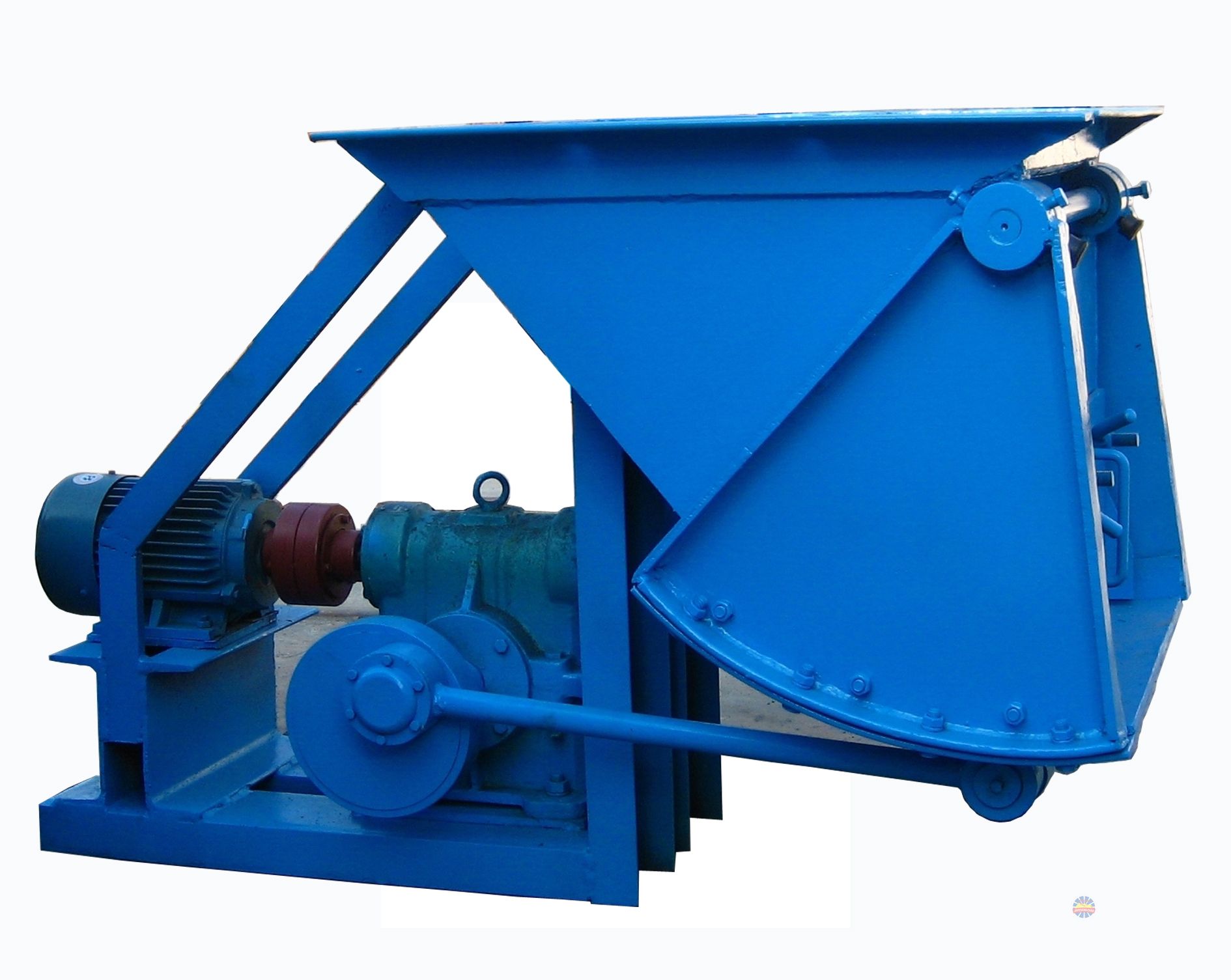 本機是利用偏心輪機構的原理,使顎板做周期的往復運動將物料連續均勻輸送出去。其原動力是依靠電動機通過渦輪減速器帶動偏心輪,再連桿后把圓周運動變為往復運動,帶動顎板往復運動。當顎板向順時針方向擺動時使堆積在它上面的物料由于摩擦力而被帶動著一起運動,從存斗器內瀉下一部分新的物料來填充機體內所向外形成的空間,當顎板作反時針方向運動時,由于內部物料的阻擋使物料無法再跟著顎板進入機體內部,因此被推入按設在其下的輸料管或輸送機的接料漏斗中,總之隨著顎板的周期性擺動就能使物料連續不斷的均勻供料。