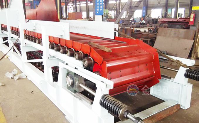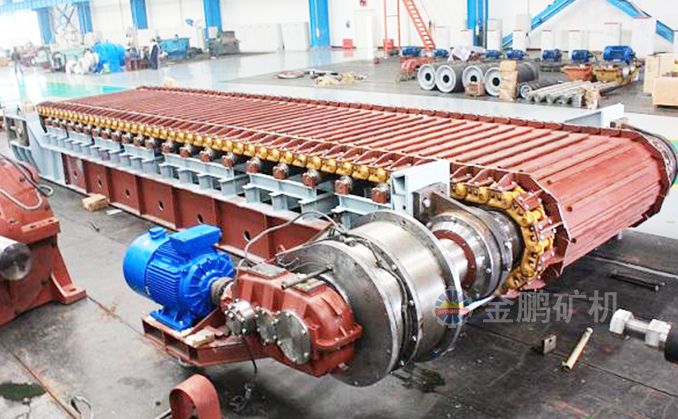 采用節(jié)距為200mm的高強(qiáng)度模鍛鏈條為牽引件,兩根鏈條繞過安裝在機(jī)體頭部的一對(duì)驅(qū)動(dòng)鏈輪和機(jī)體尾部的一對(duì)張緊輪聯(lián)成封閉形回路,在兩排鏈條的每個(gè)鏈節(jié)上裝配了相互交迭的、重型結(jié)構(gòu)的輸送槽而成為一個(gè)連續(xù)的能夠運(yùn)載物料的輸送線路。其自重和物料的重量由安裝在機(jī)體上的多排支重輪、鏈托輪和滑道梁支承。傳動(dòng)系統(tǒng)經(jīng)交流變頻調(diào)速電動(dòng)機(jī)聯(lián)接減速機(jī),再由漲套與驅(qū)動(dòng)裝置直聯(lián)驅(qū)動(dòng)運(yùn)載機(jī)構(gòu)低速運(yùn)行。將尾部料倉卸入的物料沿輸送線路運(yùn)至機(jī)體的前方排出,實(shí)現(xiàn)向下方的工作機(jī)械連續(xù)均勻喂料的目的。
