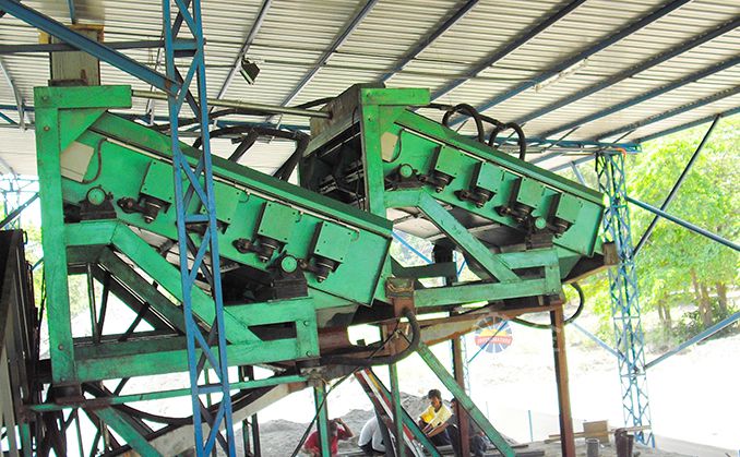 2、重選:黑鎢礦重選金鵬通常采用多級跳汰、多級搖床、中礦再磨的重選流程。細碎后合格礦經(jīng)過振動篩分級后進行多級跳汰,產出跳汰重選毛砂,粗粒級跳汰尾礦進入磨機再磨,細粒級跳汰尾砂經(jīng)過分級機后進入多級搖床選別,產出搖床重選毛砂,搖床尾礦排入尾礦庫,搖床中礦返回再磨再選,跳汰和搖床的重選毛砂進入精選作業(yè)。