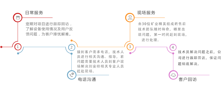 除了制造礦山設(shè)備之外,金鵬集團(tuán)還提供工程咨詢、選礦試驗(yàn)研究、 礦山設(shè)計(jì)、設(shè)備制造、安裝調(diào)試、人員培訓(xùn)、 長期跟蹤服務(wù)、選廠管理運(yùn)營等一條龍服務(wù),讓客戶全程無憂, 縮短工期,提早收益。